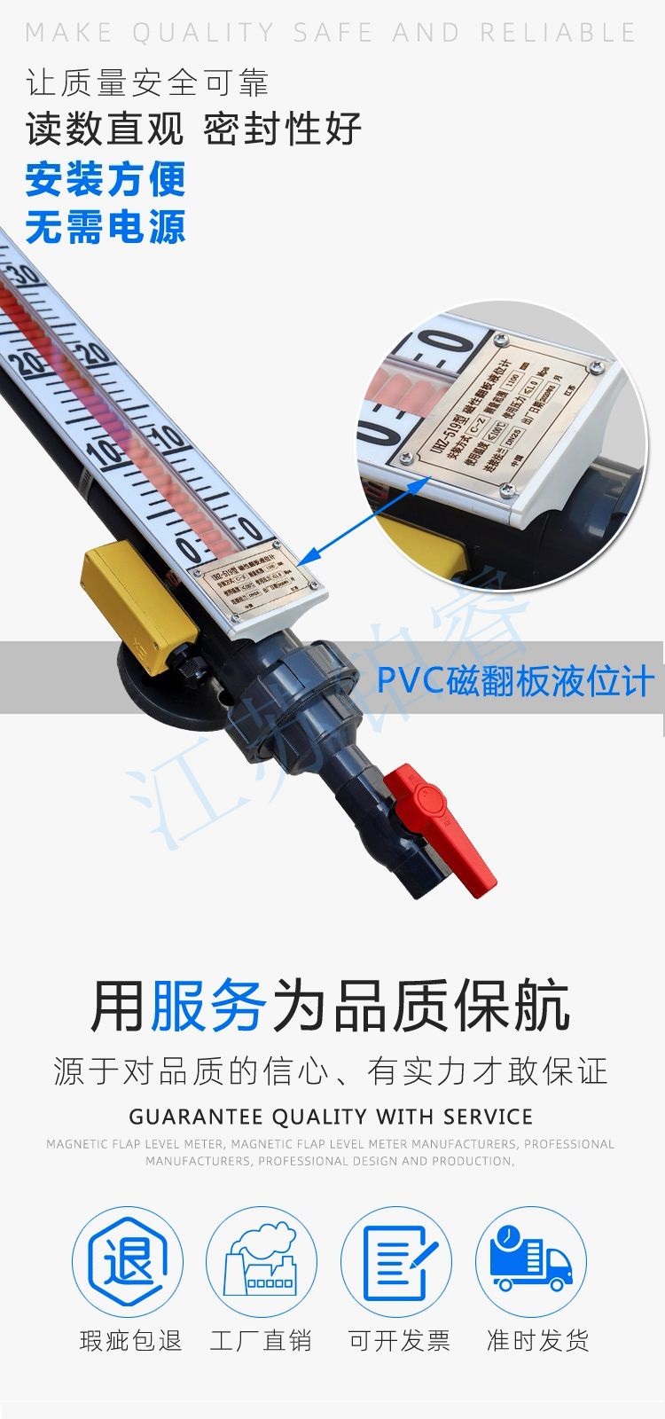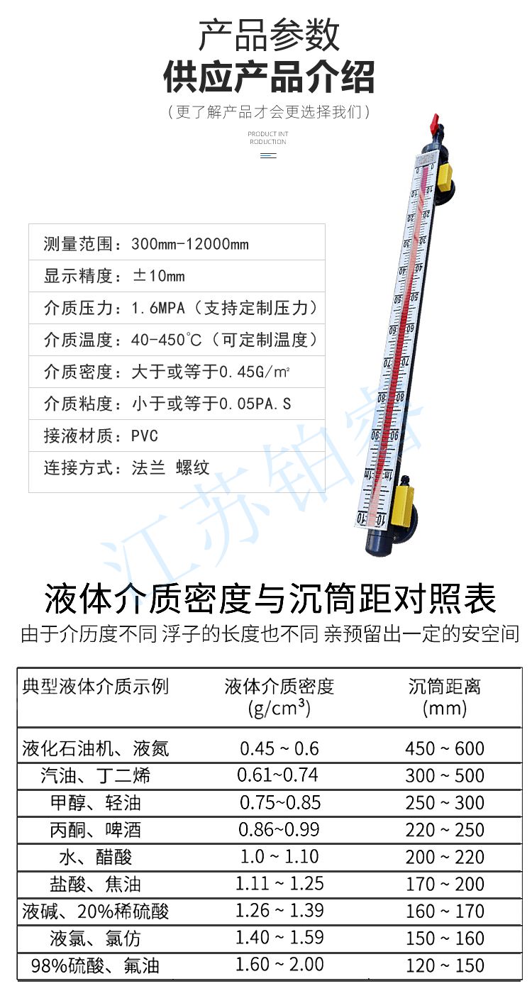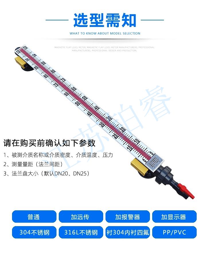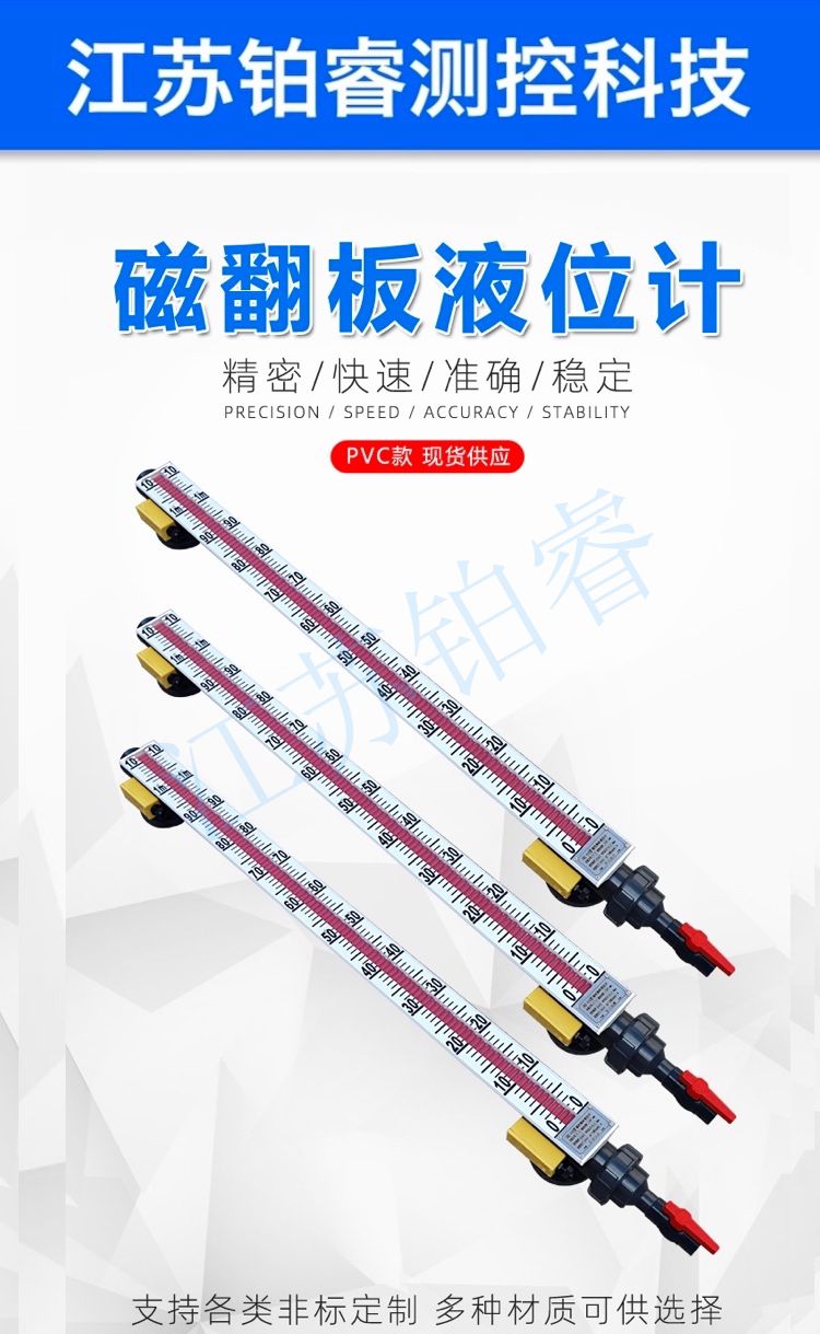 江蘇鉑睿測控科技有限公司生產(chǎn)的防腐磁翻板液位計根據(jù)用途、使用環(huán)境、材質(zhì)適用等分為304/321/316L不銹鋼輕微防腐、塑料聚氯乙稀PVC防腐、塑料聚丙烯PP防腐、不銹鋼內(nèi)襯江蘇鉑睿測控科技有限公司生產(chǎn)的防腐磁翻板液位計根據(jù)用途、使用環(huán)境、材質(zhì)適用等分為304/321/316L不銹鋼輕微防腐、塑料聚氯乙稀PVC防腐、塑料聚丙烯PP防